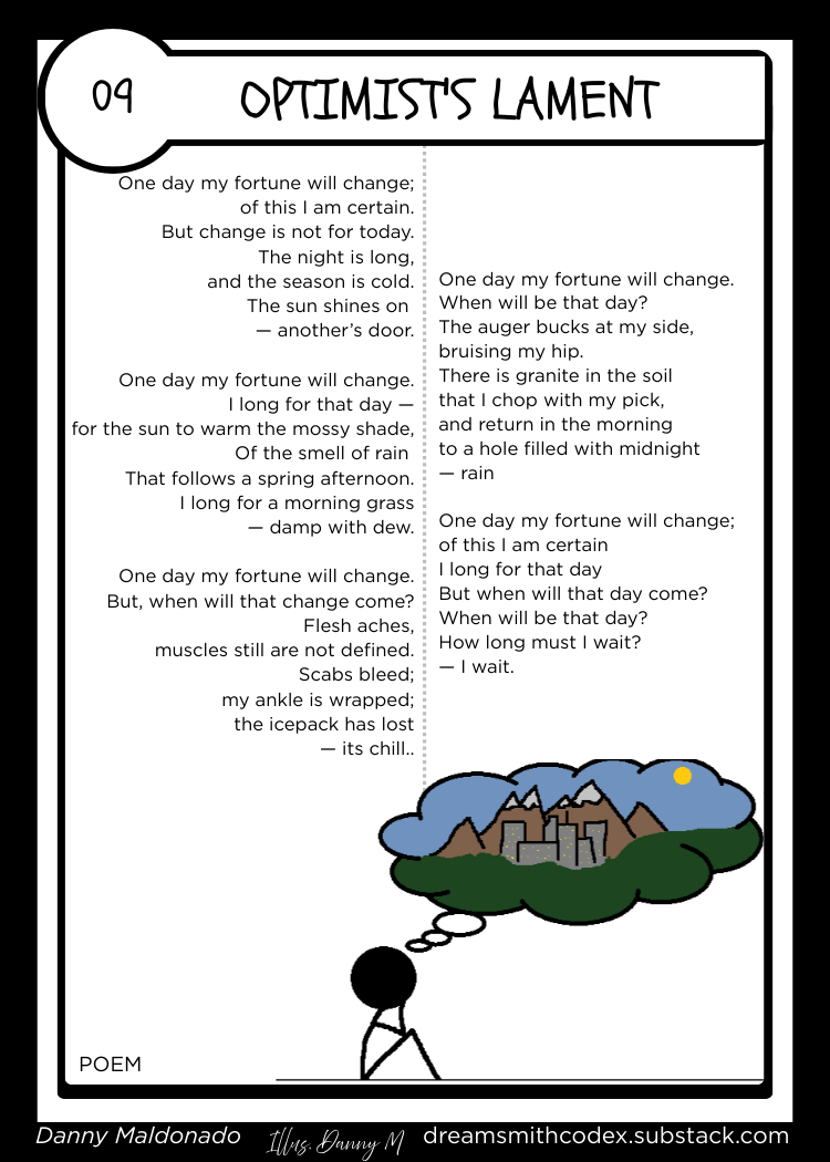 One day my fortune will change; of this I am certain. But change is not for today. The night is long, and the season is cold. The sun shines on — another’s door. One day my fortune will change. I long for that day — for the sun to warm the mossy shade, Of the smell of rain That follows a spring afternoon. I long for a morning grass — damp with dew. One day my fortune will change. But, when will that change come? Flesh aches, muscles still are not defined. Scabs bleed; my ankle is wrapped; the icepack has lost — its chill. One day my fortune will change. When will be that day? The auger bucks at my side, bruising my hip. There is granite in the soil that I chop with my pick, and return in the morning to a hole filled with midnight — rain. One day my fortune will change; of this I am certain I long for that day But when will that day come? When will be that day? How long must I wait? — I wait.