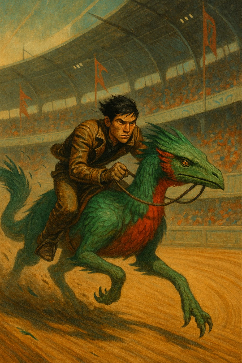 Ibra snapped the reins, and the crowd erupted into a glorious roar that shook the stadium air. The chase rail rose and whined around the track. Quetzle sprinted after the bait. His feathers clung tight to his streamlined frame as he cut through the air, clouds of red dust trailing his wake.